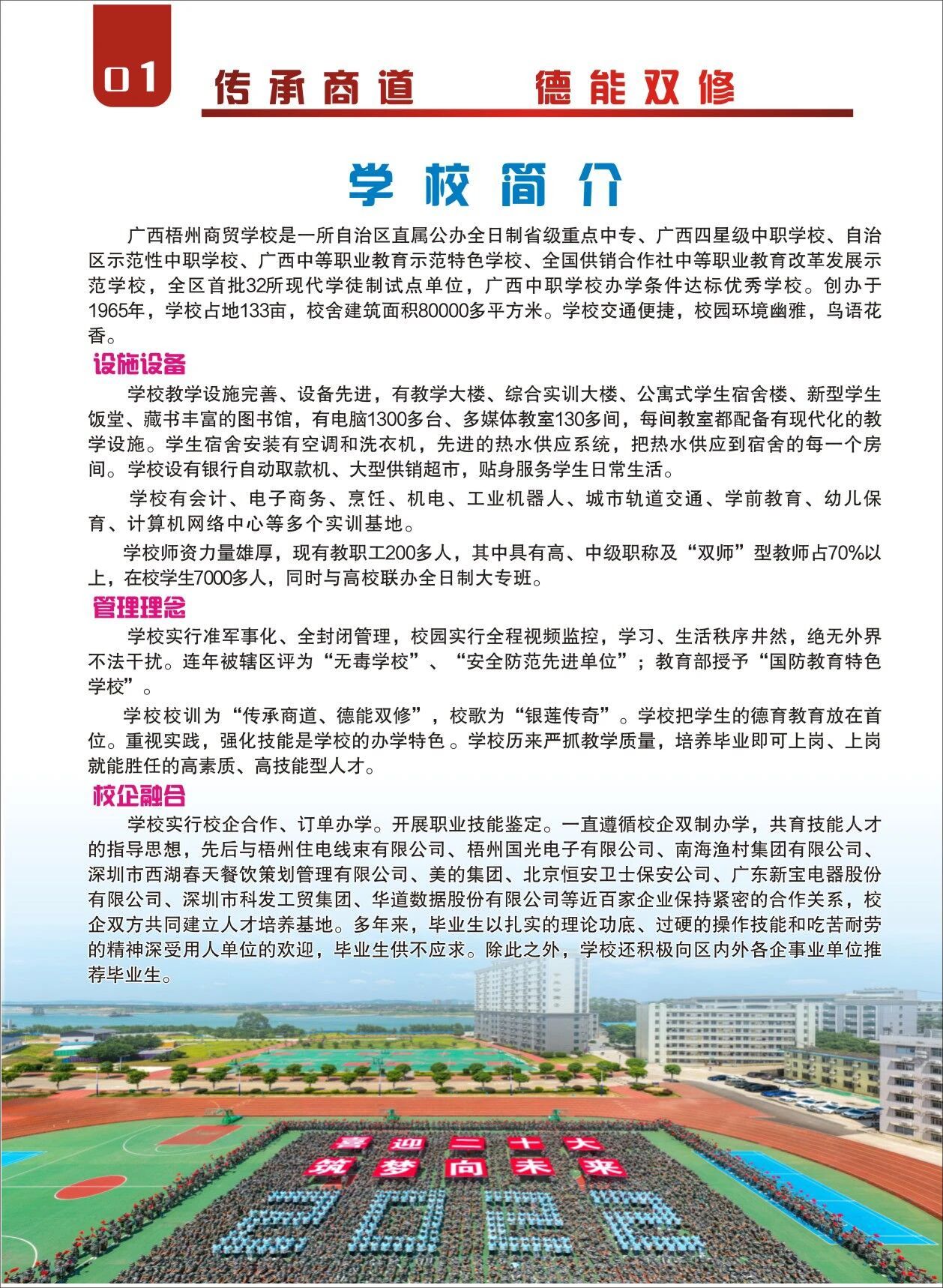 廣西中職中專網為你帶來2023年廣西梧州商貿學校招生簡章,想要報考廣西梧州商貿學校的同學可以詳細閱讀招生簡章,里面想了解的內容都有。一起來看看吧。