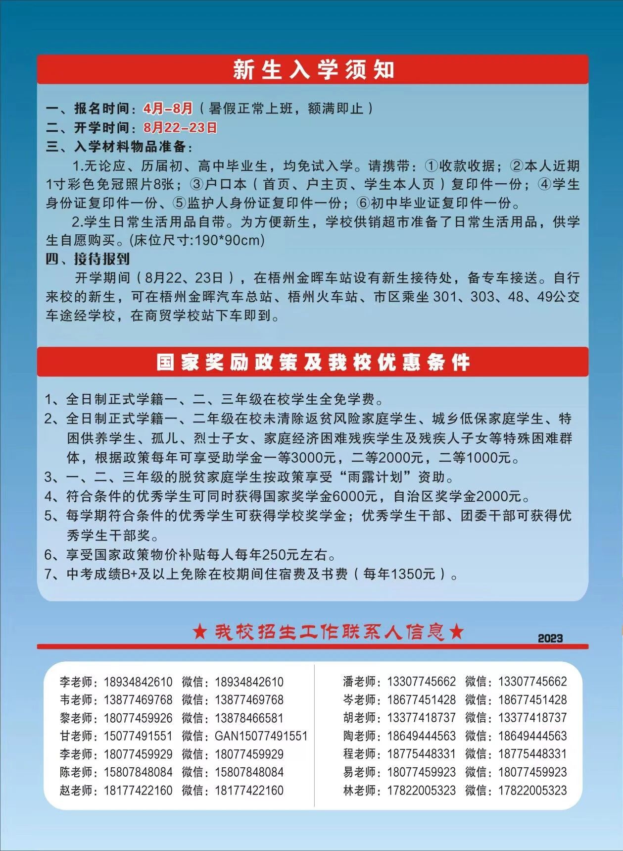 以上是2023年廣西梧州商貿學校招生簡章的全部內容,中專中職生還想了解更多關于廣西中專中職技校等資訊,如廣西中專學校分數線、廣西中職專業、廣西中專升學途徑等內容,敬請關注廣西中專招生網。